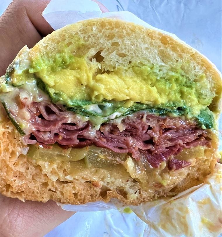 HOT PASTRAMI, AVOCADO, MELTED FONTINA CHEESE, ARUGULA, CARAMELIZED ONIONS, PICKLES AND 1,000 ISLAND ON CIABATTA ROLL