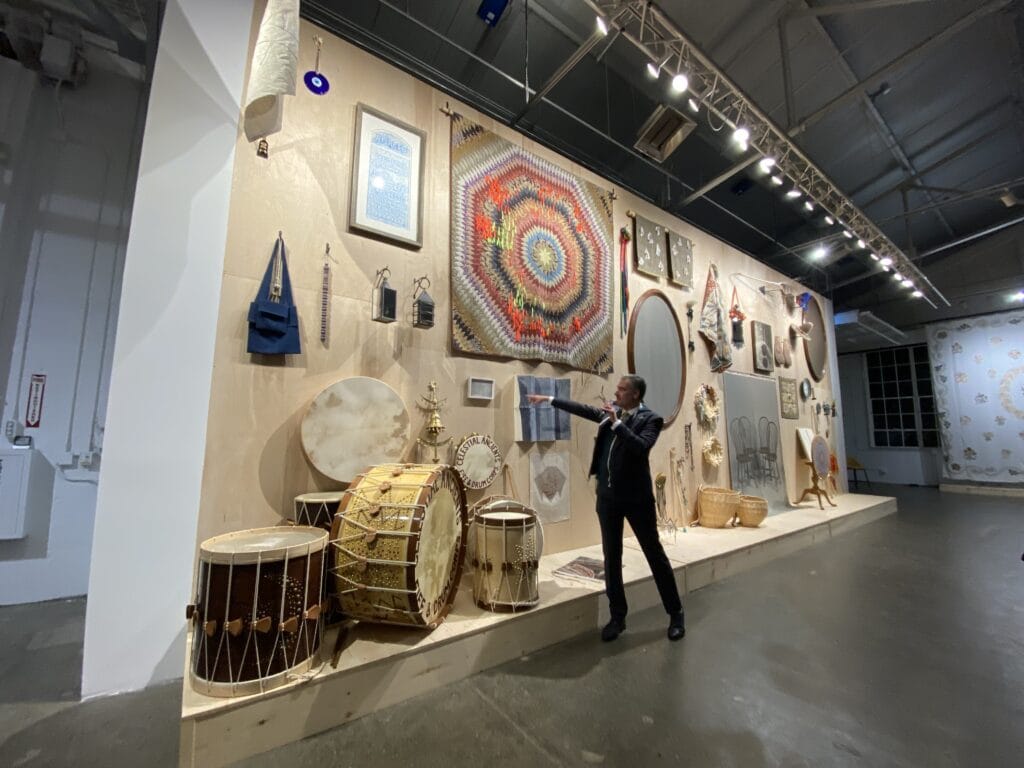 A wall of objects reconfigured from family stories.