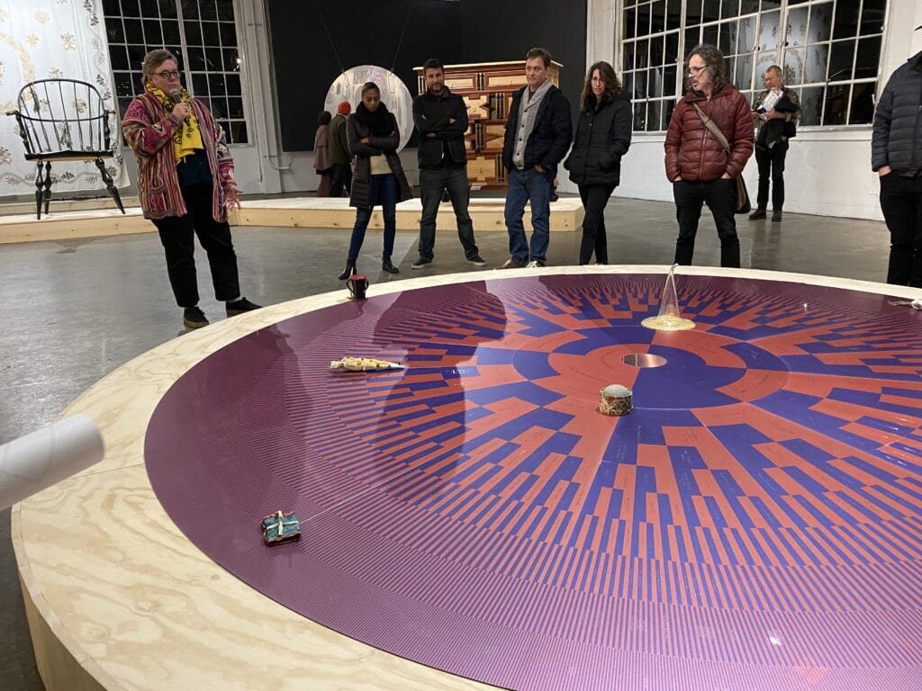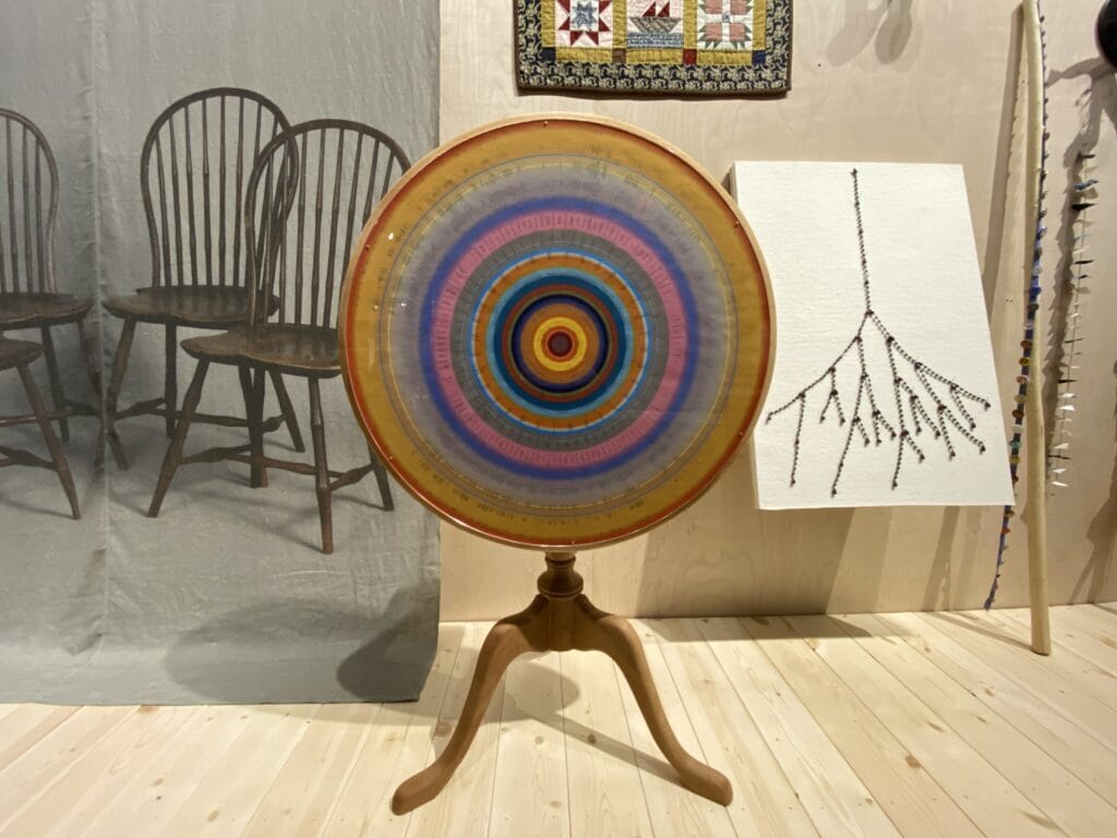 The Compass Rose on the floor is a circular map of the artist’s ancestry with Smith in the middle. In representing their family in this structure, Smith is reframing the representation of their ancestry in inclusive terms rather than patriarchal terms. This act is revolutionary because it offers an alternative to both a hierarchical and patriarchal telling of history. In each of these “traditional” ways of logging family histories, it is a straight march backward with little deviation. These systems tally marriages and forefathers instead of oral histories and a tangible residue of lives lived. Smith’s exploration of family relies on the alchemy of exploration and the reworking of material things. The show questions what gives an heirloom its power in family lore.