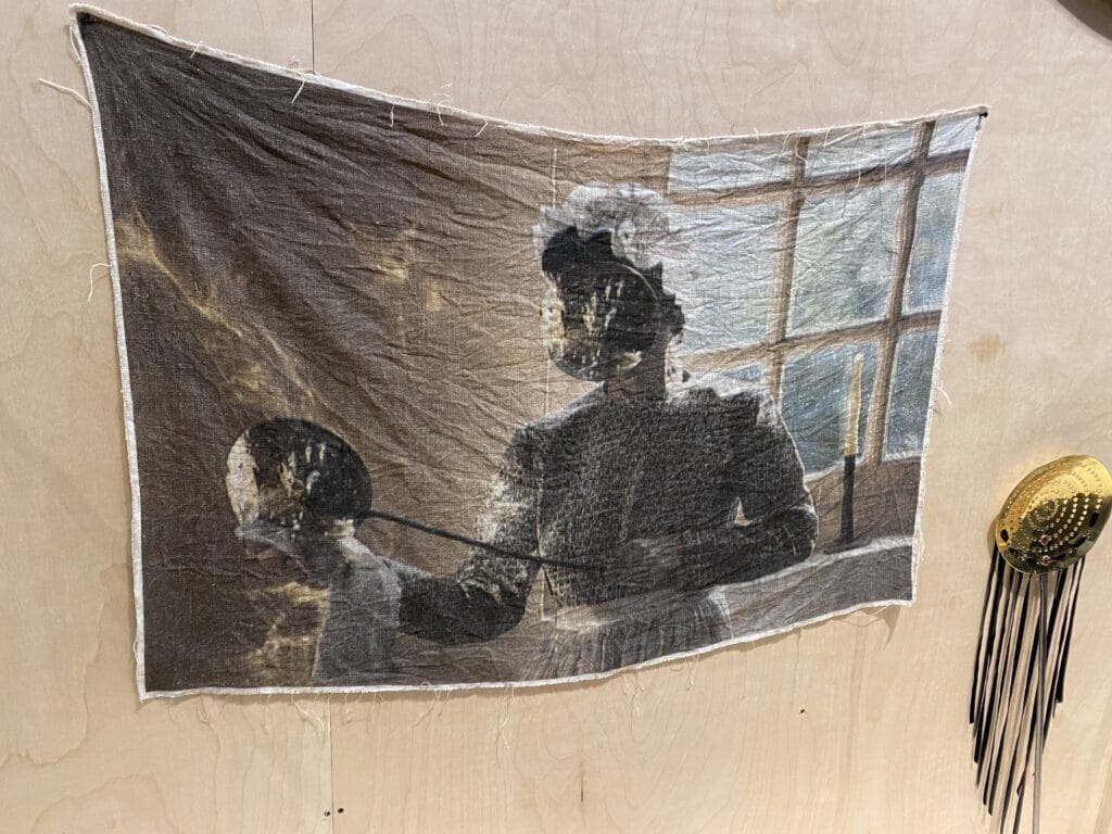 Sunny A. Smith, is a queer, non-binary artist currently living and working in the Bay Area as an educator, and their new exhibit is configured to be a sacred space to honor Smith’s ancestors. A wall to one side holds what at first appears to be a collection of artifacts, as one might find in a colonial museum. A set of drums sit in one corner, a forlorn blue “evil eye” hangs high above them. An Inkjet print on cloth shows a woman with obscured features above delicately woven baskets.