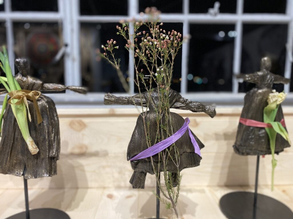 Smith examines the crafts that sustained their ancestors such as weaving, blacksmithing, pottery, glasswork, and reimagines them into objects that tell the stories that they have roamed the world to find. The artist seeks to create a new way of holding family history by connecting more to place and spiritual practices. There is a palpable connection to the earth and its life-sustaining materials in so many of the pieces. In the corner of the large photograph is a small image of Saint Wilgefortis, a non-binary saint from Portugal and Galicia. To the left of this is a delicate display of small metal figures that appear to be based on corn husk dolls.