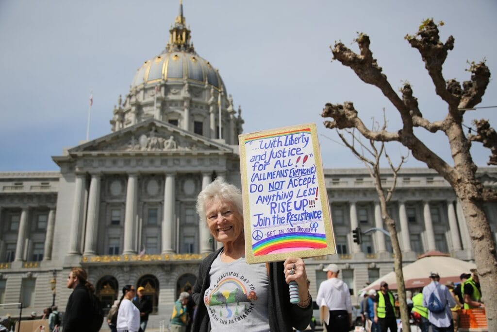 Speakers included representatives from the National Active and Retired Federal Employees Association (NARFE), Working Families Party, National Nurses United (CNA/NNU), San Francisco Labor Council, IFPTE Local 21, immigrant rights organizations, the VA, Bay Resistance, Green Action, People’s March, People’s Budget Coalition, California State Senator Scott Wiener, writer and activist Rebecca Solnit, and others.