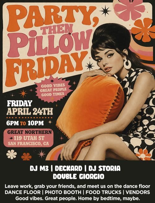 The early night party you didn’t know you needed. Leave work, grab your crew, and meet us on the dance floor Friday, April 24th at Great Northern. Party, Then Pillow runs 6PM–10PM—just enough time to catch a vibe and still wake up feeling good. Photo booth, food trucks, & NA drinks as well!