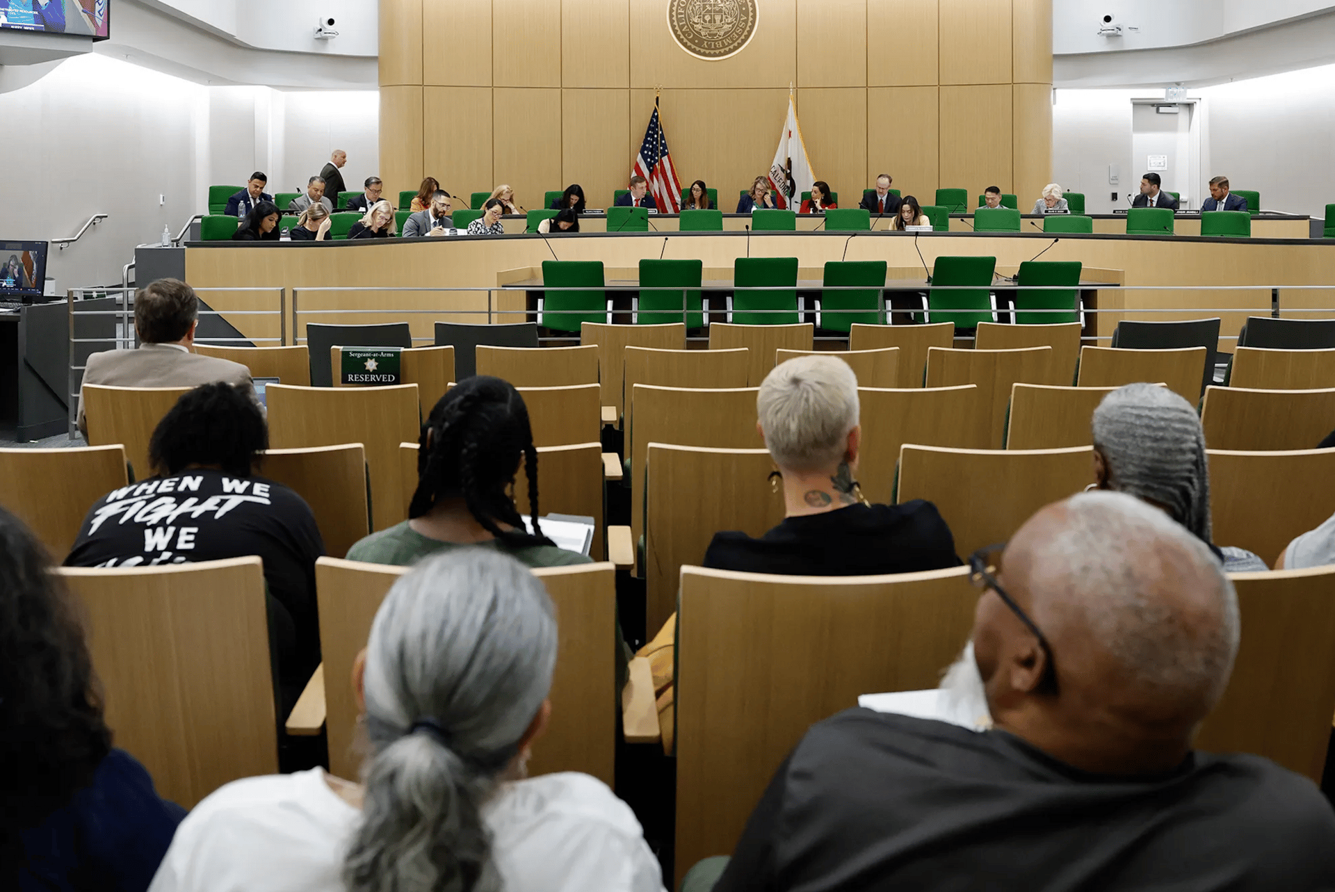 People listen during a hearing of the suspense file in the Assembly Appropriations Committee at the Capitol Annex Swing Space in Sacramento on Aug. 29, 2025. Photo by Fred Greaves for CalMatters