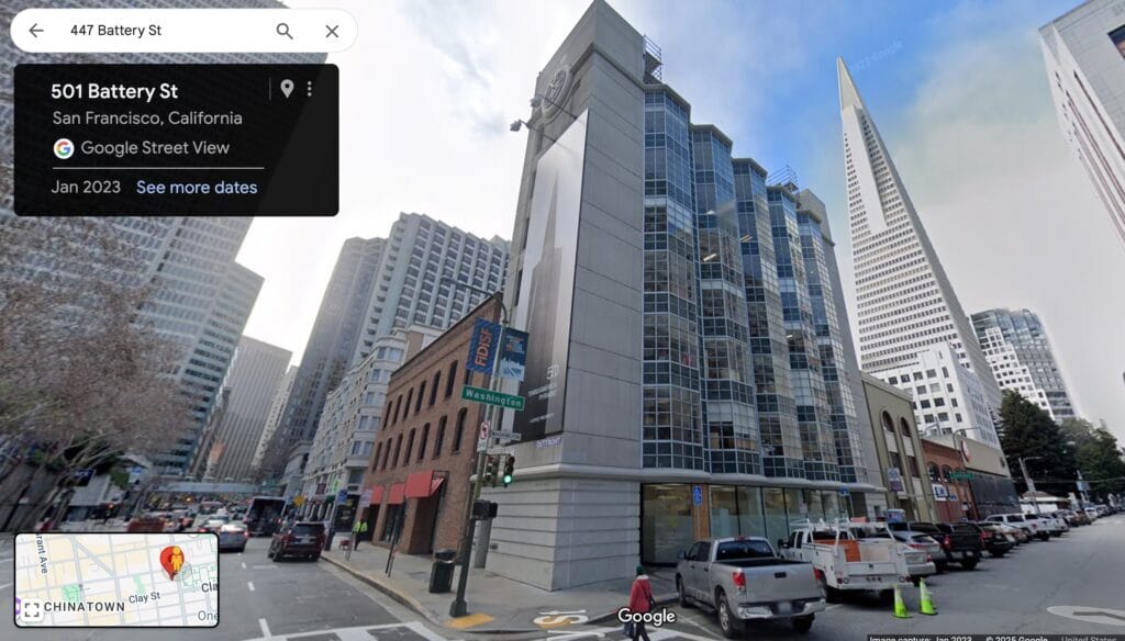 447 Battery with the Transamerica Pyramid in view, from Google Maps Street View.