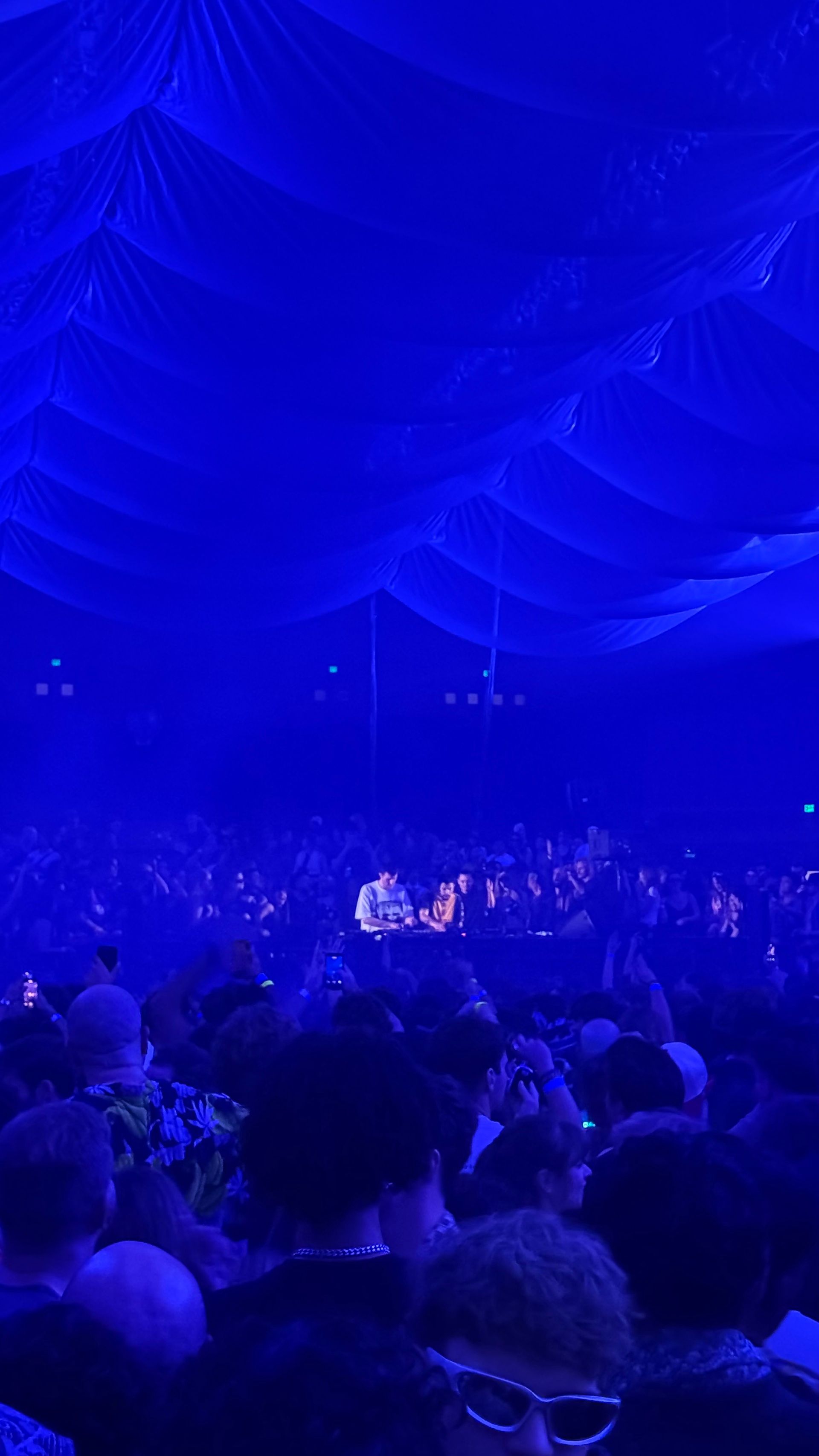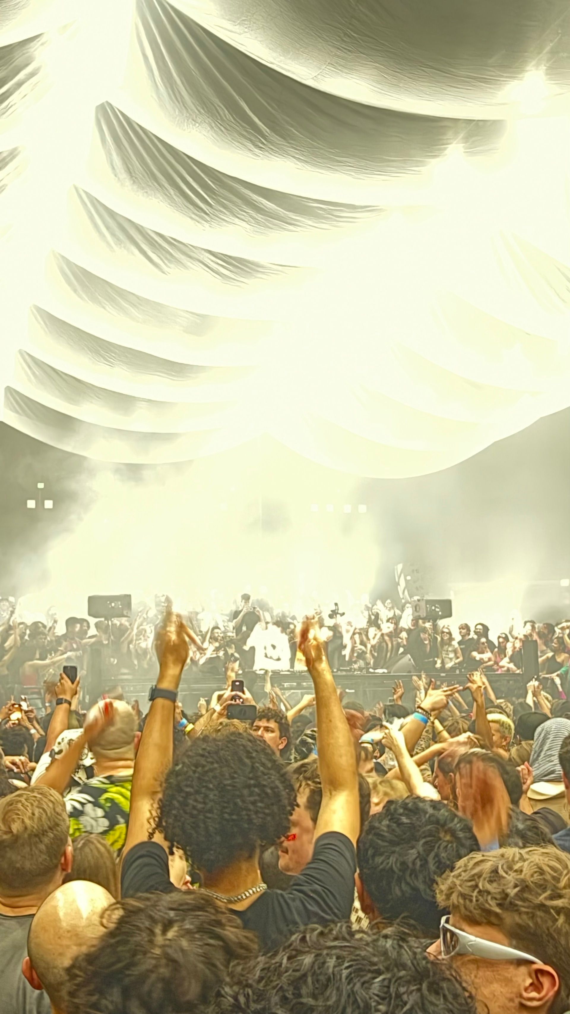 The crowd rose up around me into the bleachers like waves ready to crash. Undulating above me was this beautiful, minimalist fabric flying art piece. And at the end of the hall was a set of CDJs for the man of the hour.
