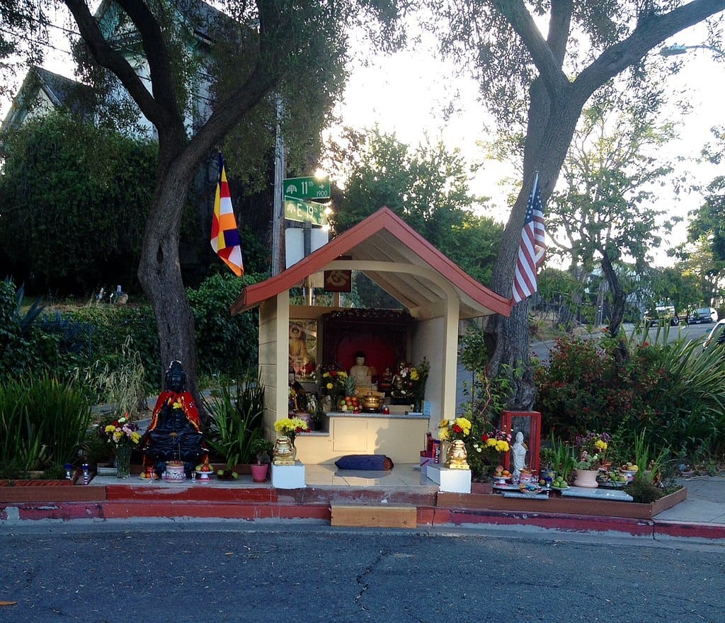 Not long after Dan placed the Buddha statue in the usually garbage-laden traffic median, something miraculous happened – the dumping stopped. Not only that, but the statue was expanded upon and became a full shrine for Oakland’s Buddhist community to pray at. The presence of the Buddha statue didn’t only stop illegal dumping, but reduced crime of all kinds within a one-block-radius of it. From the time the statue officially became a shrine in 2012 up until 2019, crime decreased by 82 percent. According to the article I just linked to, the police had no other explanation for the sharp decrease.