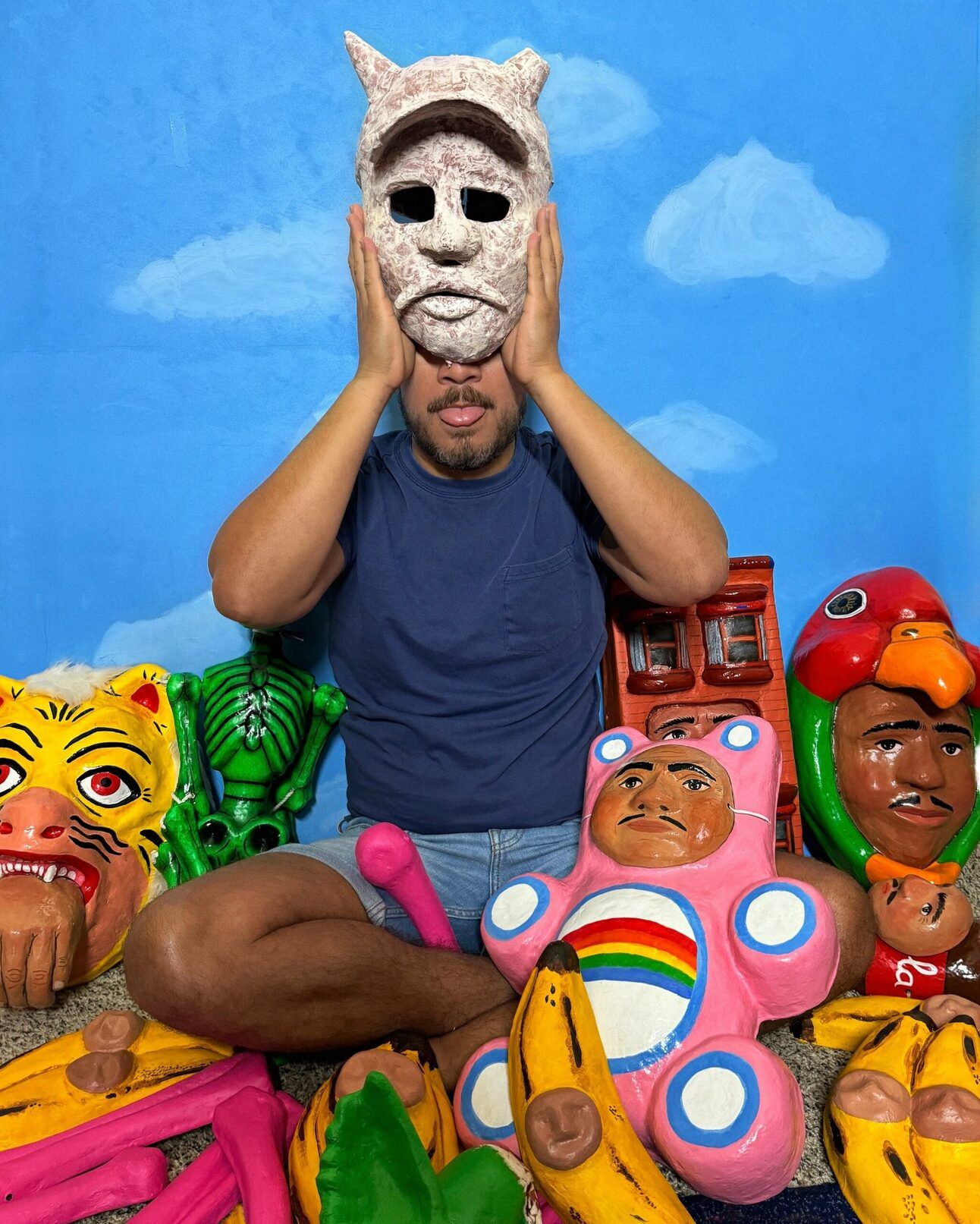 Hernandez’s bio explains that his masks reflect his identities: “I had to wear several masks growing up, whether it was trying to act more Mexican or American, or even hiding the fact that I was gay.” As a child in Mexico, he remembers making piñatas and easter egg decorations out of papier-mâché. “We were not well-to-do in Mexico so my mom would make it a fun activity for us to do,” he says.