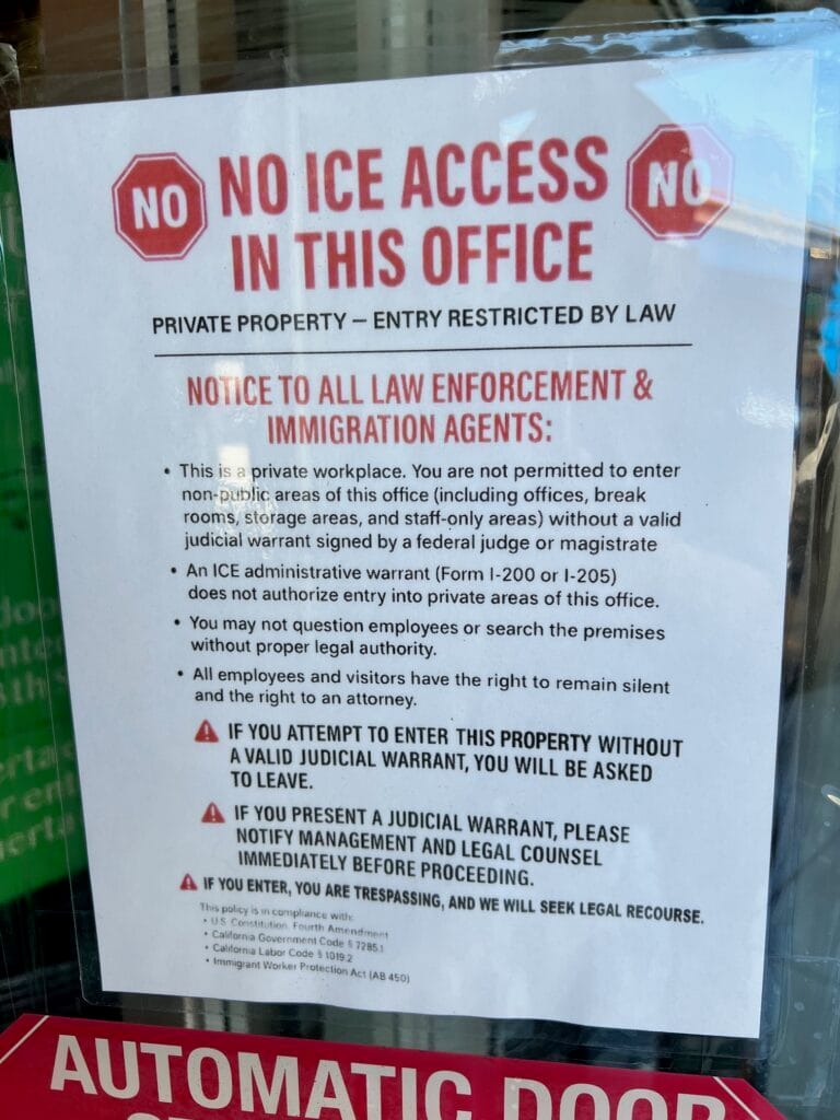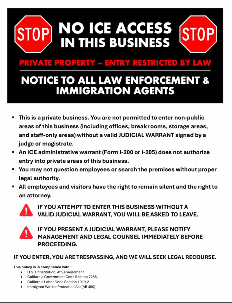 DOJ Attorney: The short answer is “yes”. The more complicated answer is that when masked ICE agents force their way in like a bunch of thugs, the recourse is pretty limited. But I absolutely encourage business owners to put up signs just like that, make sure everyone understands the policy, and follow it.