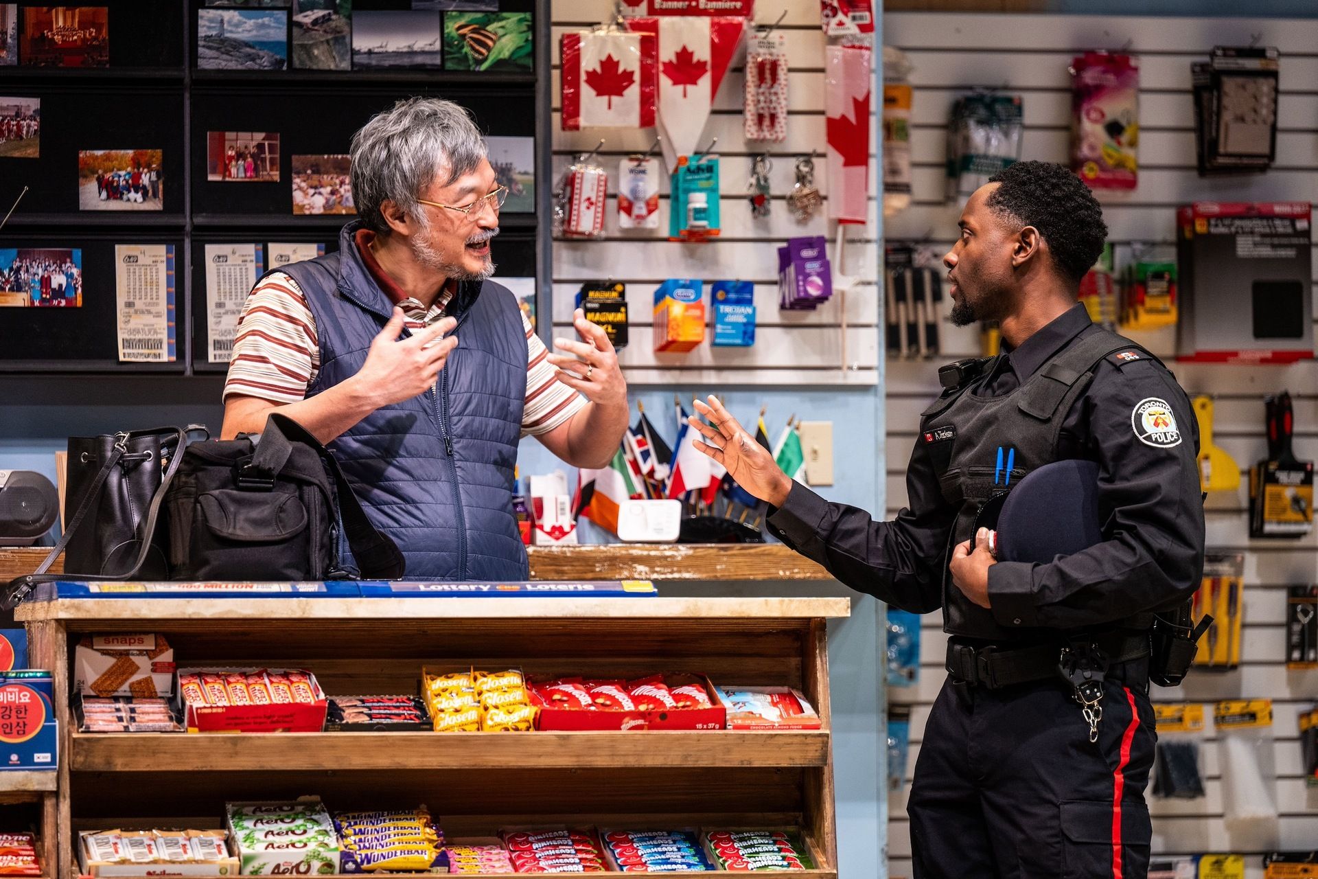Ins Choi and Brandon McKnight in Kim’s Convenience (2025). A Soulpepper Production in association with American Conservatory Theater & Adam Blanshay Productions. Photo by Dahlia Katz.