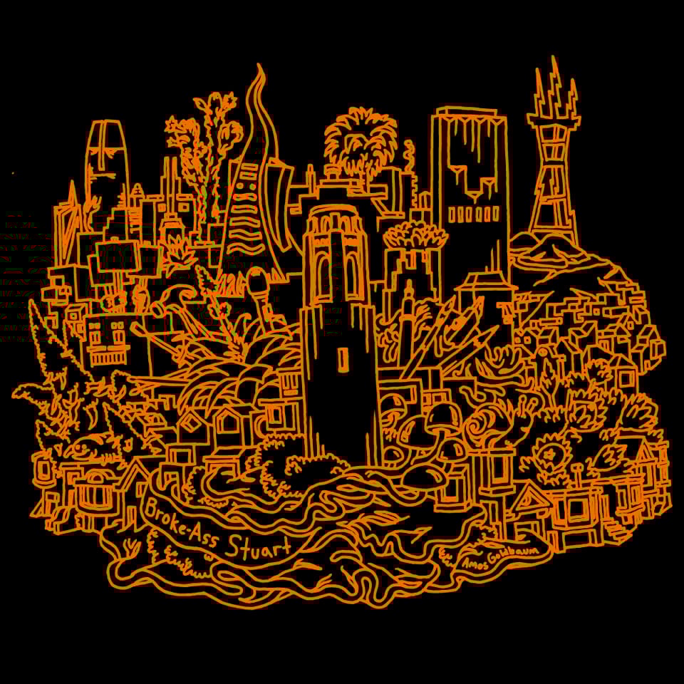 I’m SOOO excited to announce the release of this rad new shirt. The legendary San Francisco artist Amos Goldbaum put a lot of thought and effort into creating something that reflects the weird and wonderful things we do at BrokeAssStuart.com. We worked with him to come up with is this fantastic design: