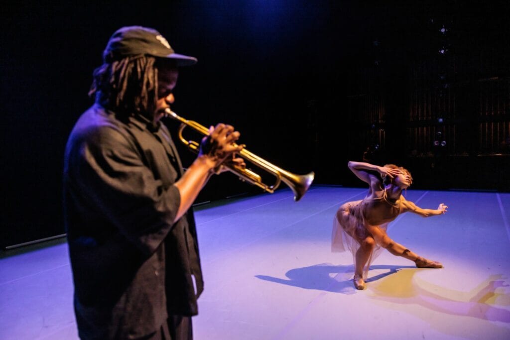 Jazz trumpeter Ambrose Akinmusire and dancer Marusya Madubuko perform in The Beauty ofDissolving Portraits. Photo by Chris Hardy.