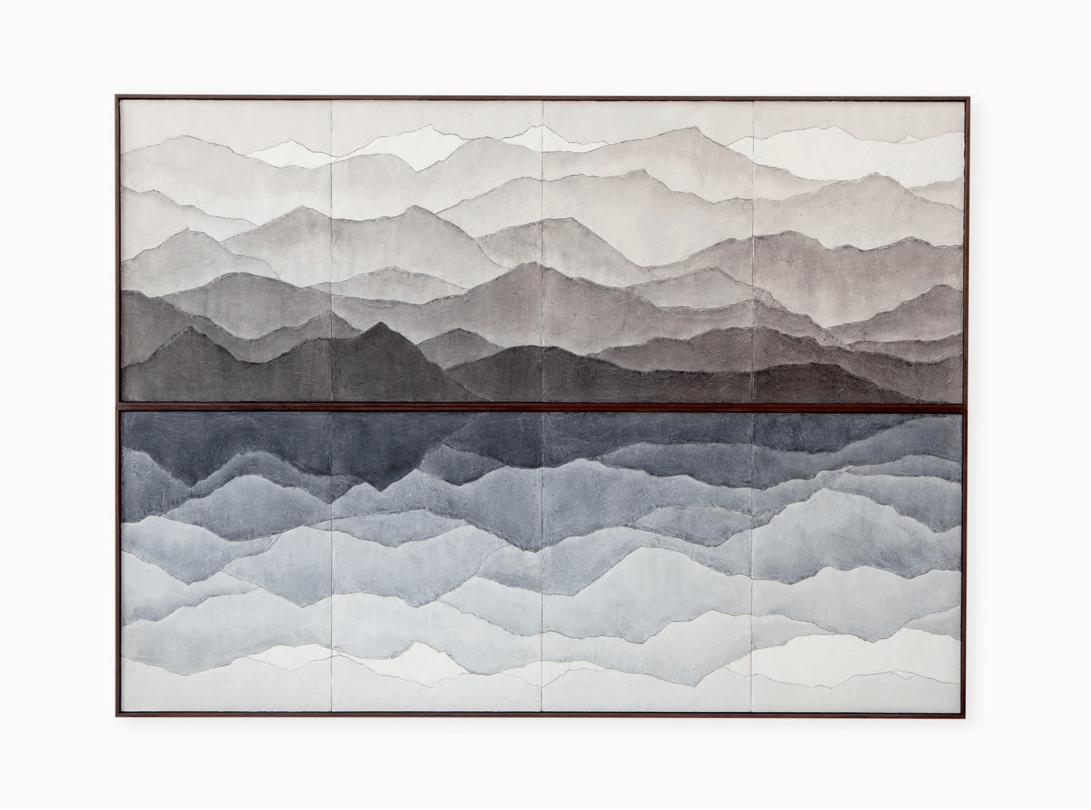Utilizing soldering irons, paper pulp, and the delicate manipulation of hand-drawn marks, Oenema constructs a world where precision gives way to texture. In another diptych, Reflections, rounded peaks and their mirrored counterparts suggest a mountain range above still water. Step closer, and they resolve into a hand-sawn jigsaw puzzle assembled from the artist’s imagination. Each piece, cut and created individually, joins the others to form a quiet suggestion of peace.