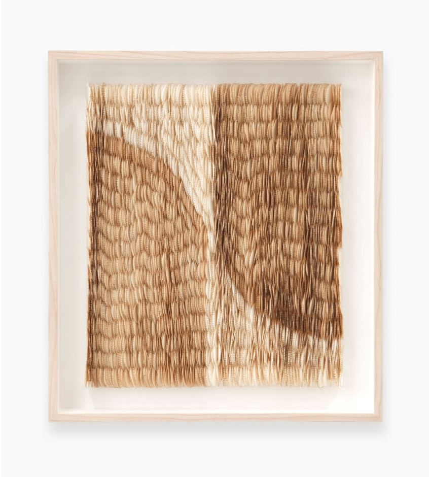 In the back gallery, I encounter a diptych composed of four types of Japanese paper: kozo off-white and cream, shoji white, and Awagami Kitakata. Thousands of tiny circles, burnt meticulously with a soldering iron, are spaced densely like hairs on a head. They form curving, sensual lines within strict borders. Reminiscent of wind patterns in tall summer grasses, the work in Oenema’s Echo series seems to hold motion itself within its frame.