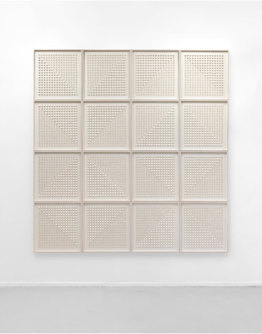 Burnings, Variation X dominates the rear wall. Sixteen framed pieces create a unified grid, an arrangement that now feels emblematic of Oenema’s visual language. In front of it, a white table offers a neatly stacked pile of postcards printed with squares from the grid. Viewers are invited to cut and rearrange them into new patterns, like raking sand in a Zen garden.