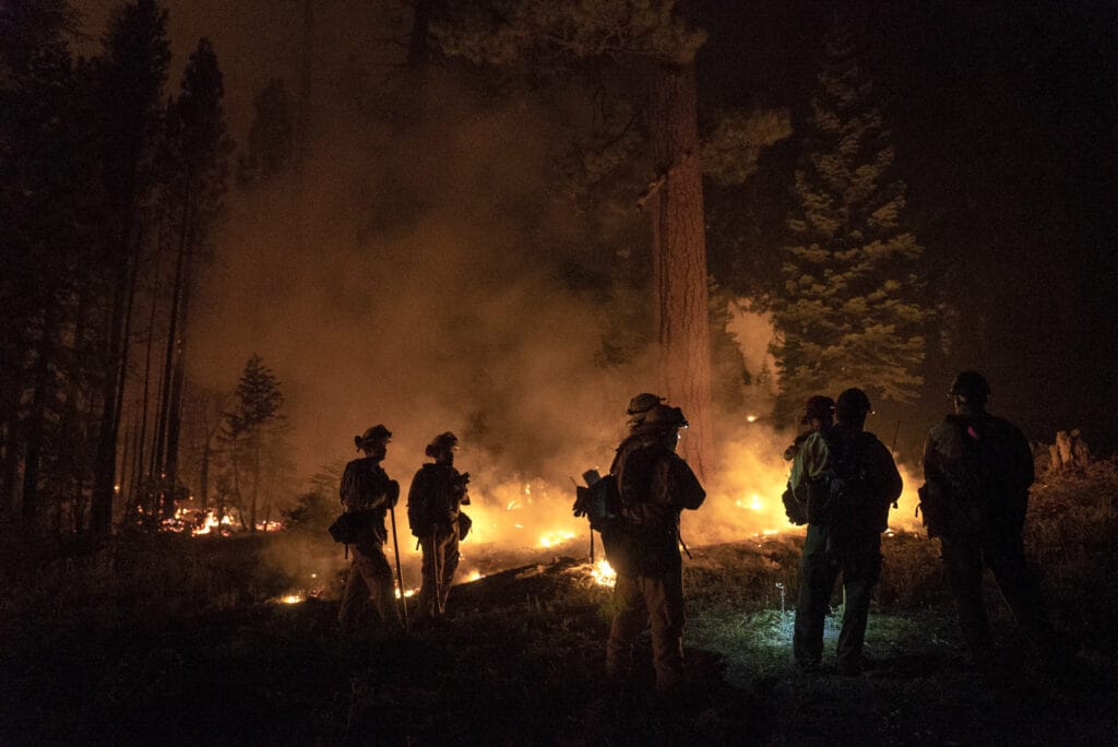 Forest Service and Cal State firefighters work together in a night operation to push back a fire line at the Donnell Fire, Stanislaus National Forest, California. (Forest Service photo by Cecilio Ricardo)
