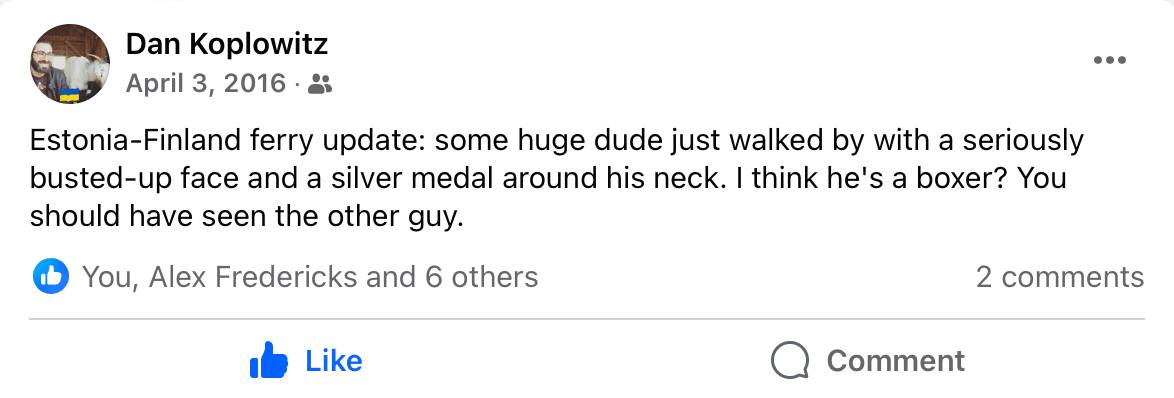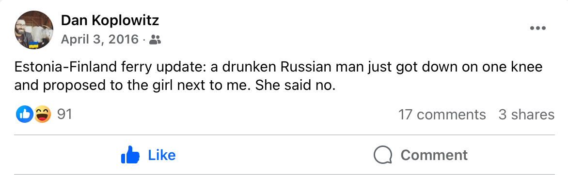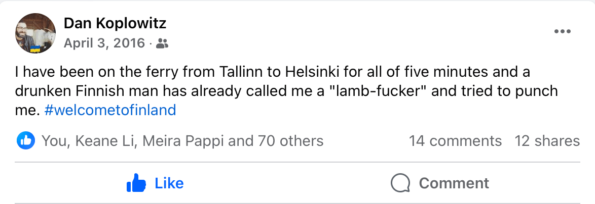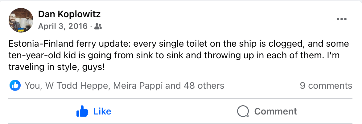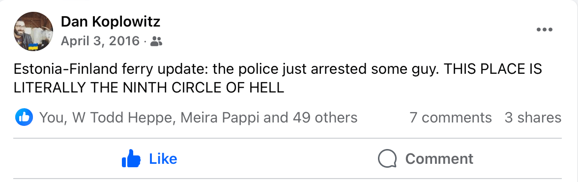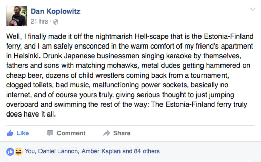 My buddy Dan Koplowitz has a business where he gets music into movies, shows, and commercials. It’s called Friendly Fire Licensing. He deals with bands all over the world so he travels a lot, and he spends a good amount of time in the Nordic region. Awhile back he took a ferry from Tallinn, Estonia to Helsinki, Finland. It was an absolute shit show and Dan kept us all hilariously updated with his Facebook posts. I choked from laughing so hard.