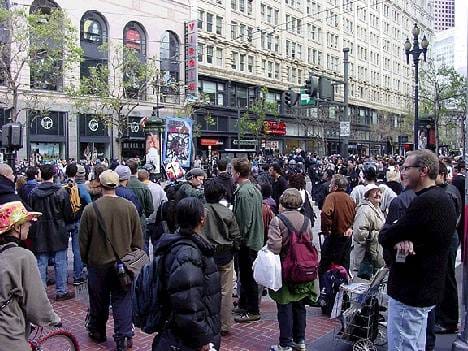 Thousands of protesters used their individual skills, knowledge, and networks to get out on the streets and shut The City down. They gathered at Market and 4th, blocking traffic. The cyclists who had been gathering for Critical Mass put their organizing work to immediate use, attempting to block traffic to the Bay Bridge. And most obscenely, several protestors began gagging themselves and vomiting around the Federal Building to prove that the war was making them “sick to their stomachs,” so to speak.