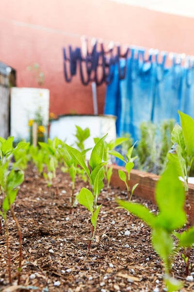 Kristine Vejar (front) and Adrienne Rodriguez (back) work in their home garden which is filled with natural dye plants – photo by Sara Remington