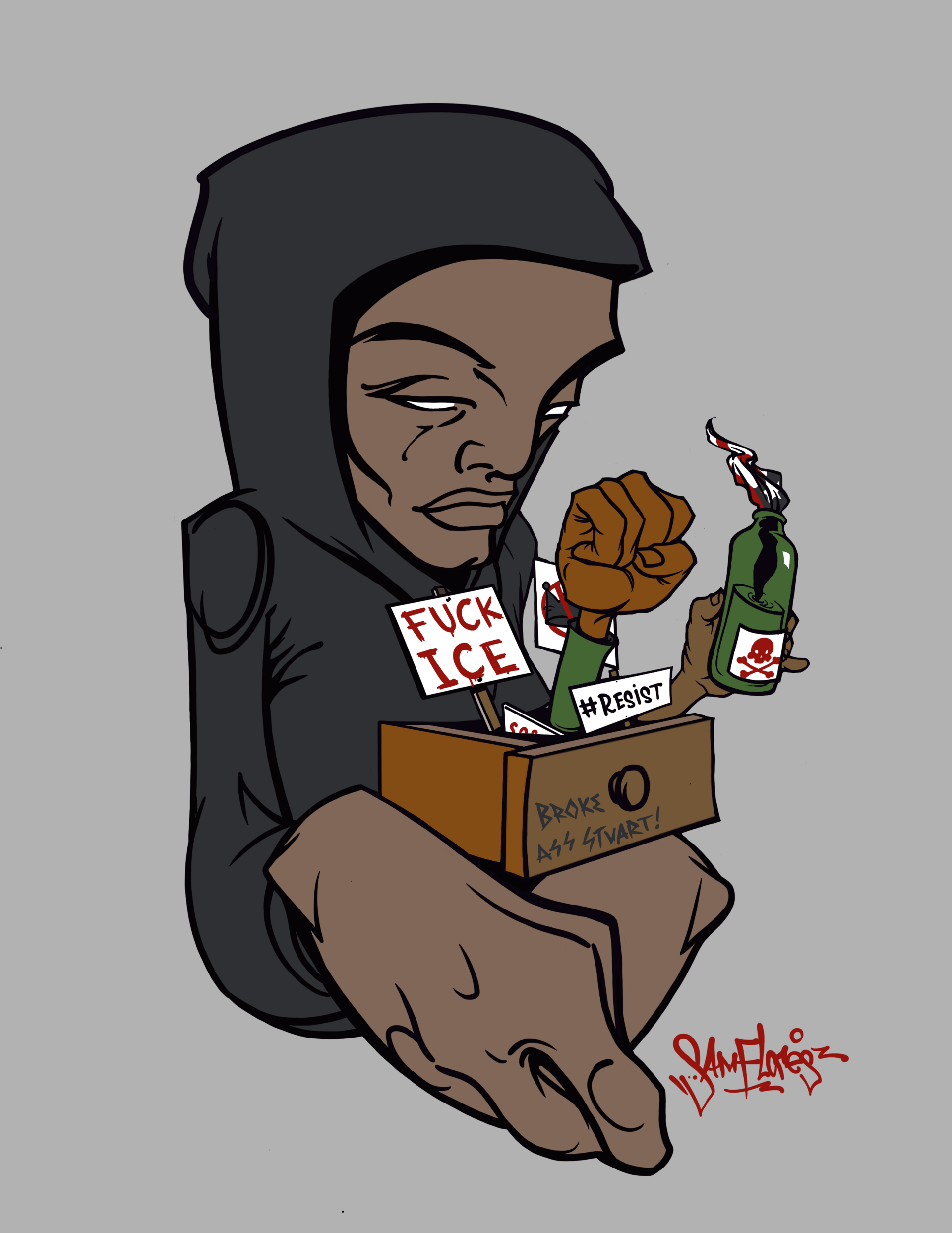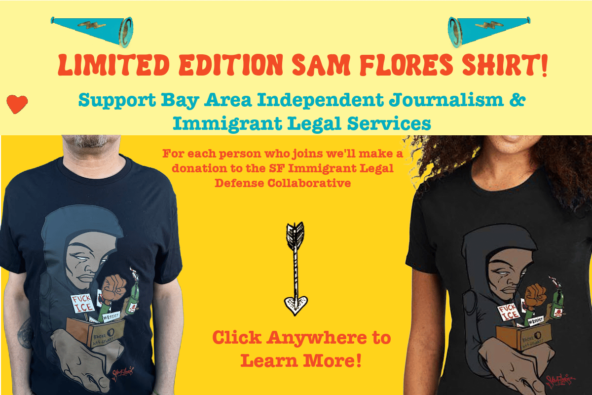 We asked legendary SF artist Sam Flores to design a shirt to represent Bay Area activism and resistance, for those who wish to artfully protest the fascist and unconstitutional actions of ICE on our streets.