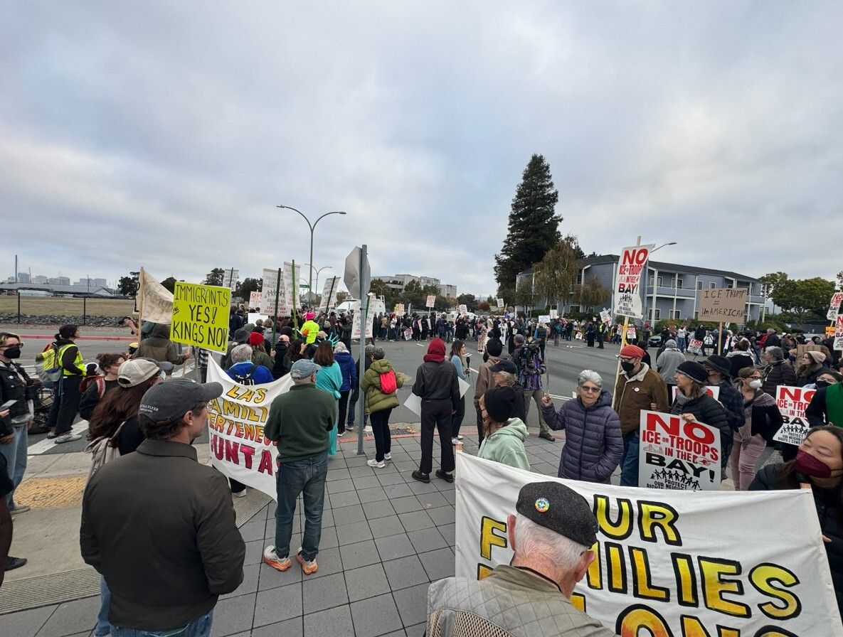 Since the early morning clash, the picket line has been largely unbroken and unmolested by federal agents. Protesters began walking in a continuous circle through the crosswalks leading to the bridge, because in California, pedestrians legally have the right of way.