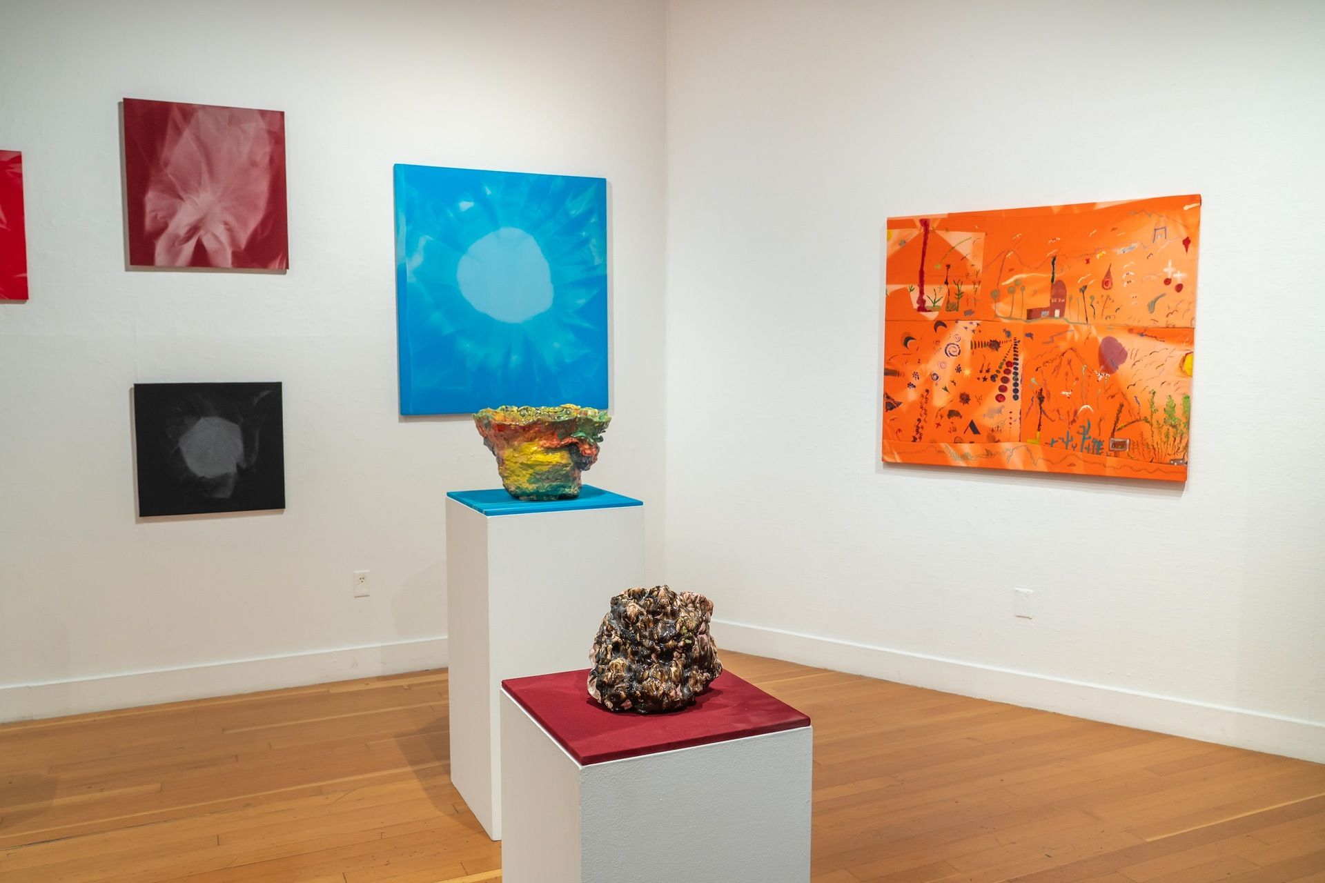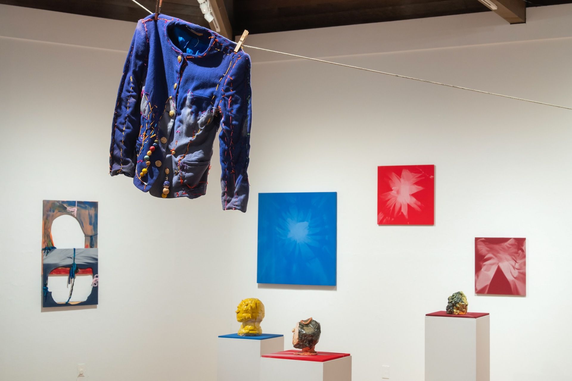 Brightly colored cloths holding faded sunbursts of light line the back wall, paired with whimsical ceramic sculptures in front. Woven clay and faces emerging from behind rainbow veils of glaze rest on plinths. Each piece stands on its own, yet all seem to be in quiet conversation, their individual rhythms creating a visual pulse throughout the room.