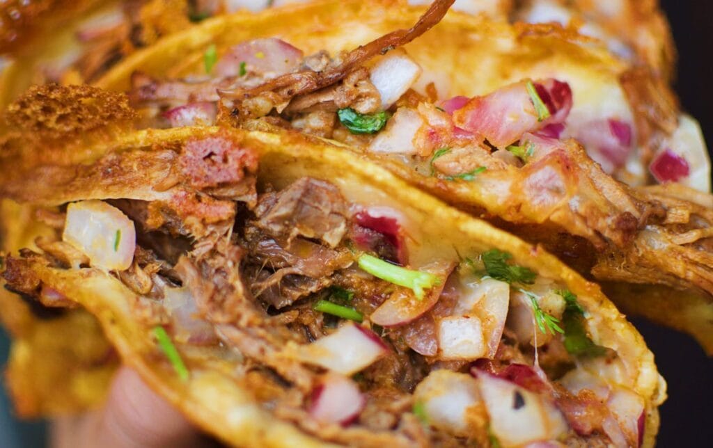 Quesabirrias have also been called red tacos, thanks to the tortilla being dipped in its accompanying consommé. A more accurate description would call a quesabirria a mix between a taco and a quesadilla. It essentially consists of a crunchy tortilla, melted cheese, and stewed beef. But that’s sort of like saying “Spider-Man: No Way Home” is about a bunch of guys whose hands and feet can stick to walls.