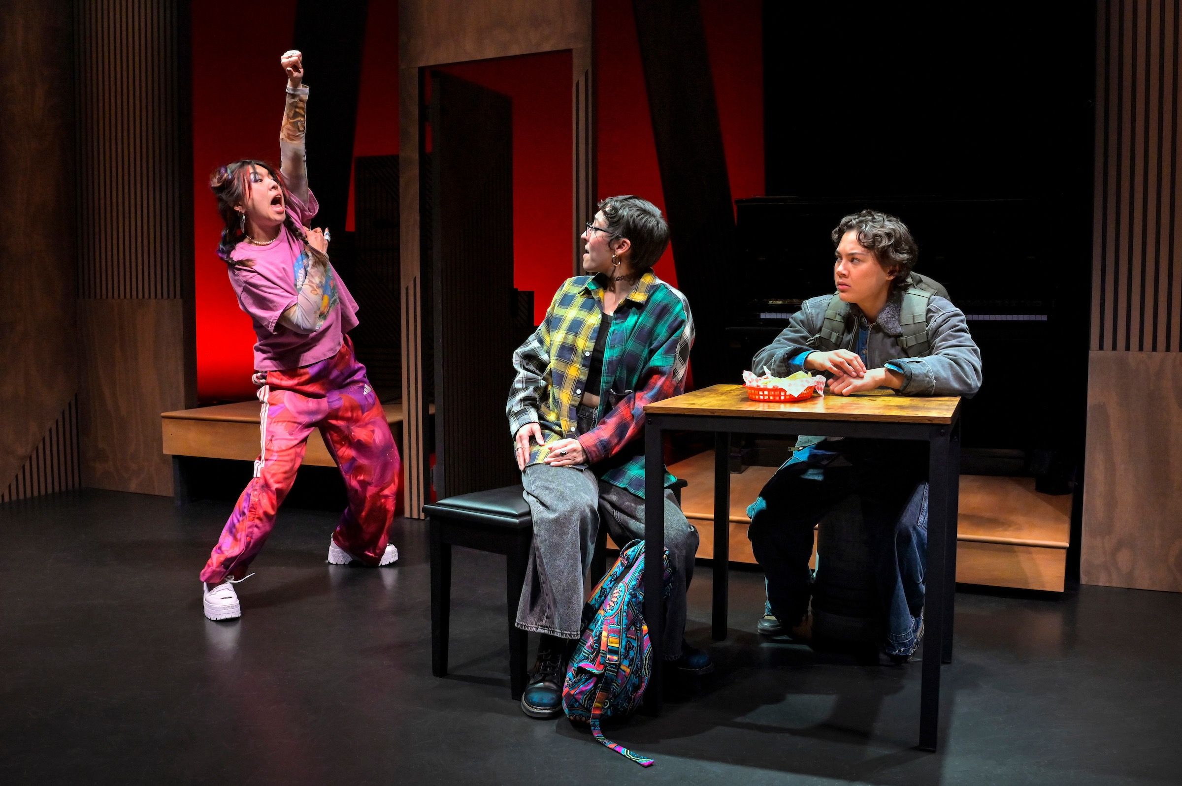 Gianna DiGregorio Rivera(Clementine),Hillary Fisher(Fax), and Naomi Latta(Margot) in the world premiere of Eisa Davis’ ||: Girls :||: Chance :||: Music :||, performing at A.C.T.’s Strand Theater now through April 19, 2026. Photo credit: Kevin Berne.