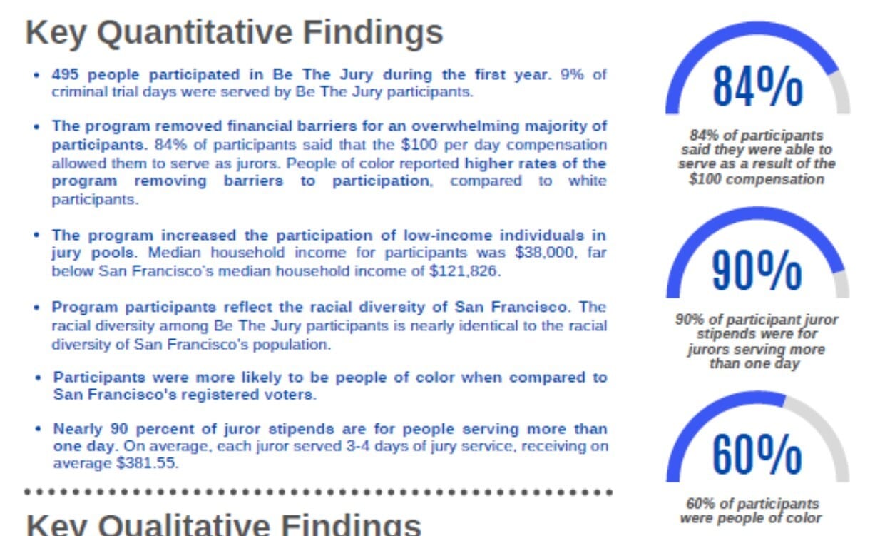“No one should have to decide between making ends meet or fulfilling their civic duty,” said San Francisco Treasurer José Cisneros. “The Be The Jury program results make it clear that paying people to serve on juries is a necessary step towards upholding our constitutional right to a trial by peers.”