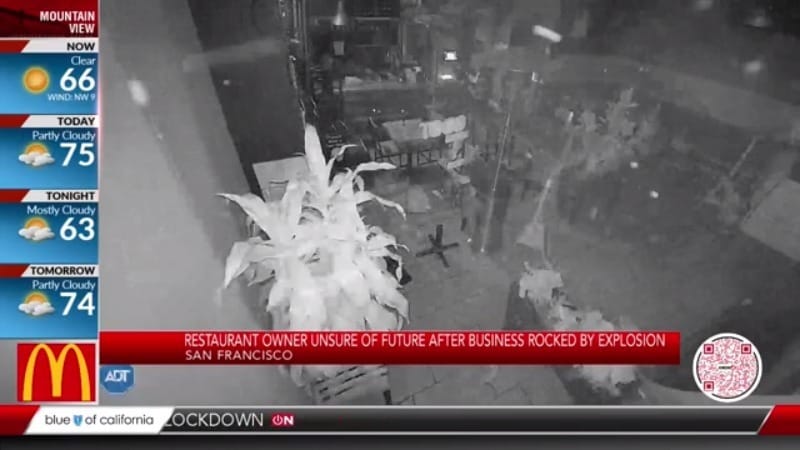 Debris captured flying through the air on security footage from Lapats Thai Noodle Bar, 7/23/21. Courtesy KRON4.
