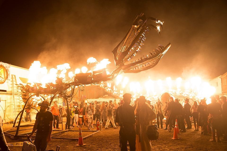 The particular year I’m writing about, probably 2015 or so, now lives on in my memory as one of my favorites out of the event’s ten-year history. Ear-to-ear grins permeated among my camp members as we threw a party attended by over 1000 guests, entertained by not only that huge ferrous dragon but also a cuddle puddle comprised of hundreds of life-size teddy bears, roaming type-writer-equipped poets pecking out bespoke musings on demand, and a now-famous (then lesser-known) programmed LED drapery hundreds of square feet in size known as Firmament. And oh yeah, all those life-size teddy bears reclined, of course, underneath all those blinky programmed LEDs.