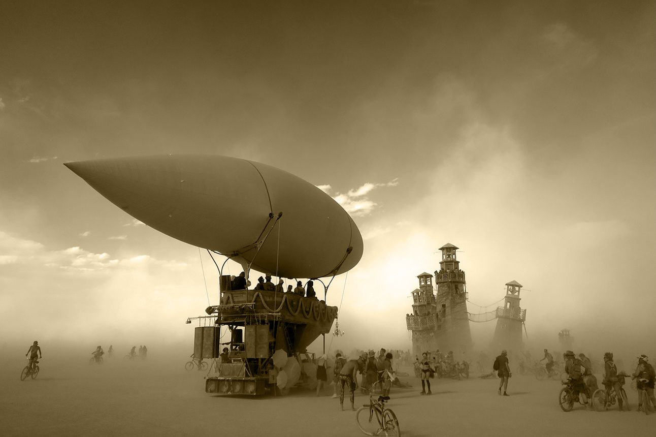 We started Airpusher in the traditional way most get involved with art car-themed Burning Man projects—drunk on ambition, youthful energy, and perhaps from time to time, other mood-altering substances. This year will be Airpusher’s tenth anniversary gracing the playa with its ramshackle splendor, trundling about the barren desert doling out beats and a psychedelic light show from its projection art dirigible like some sort of mobile technicolor dreamcoat.