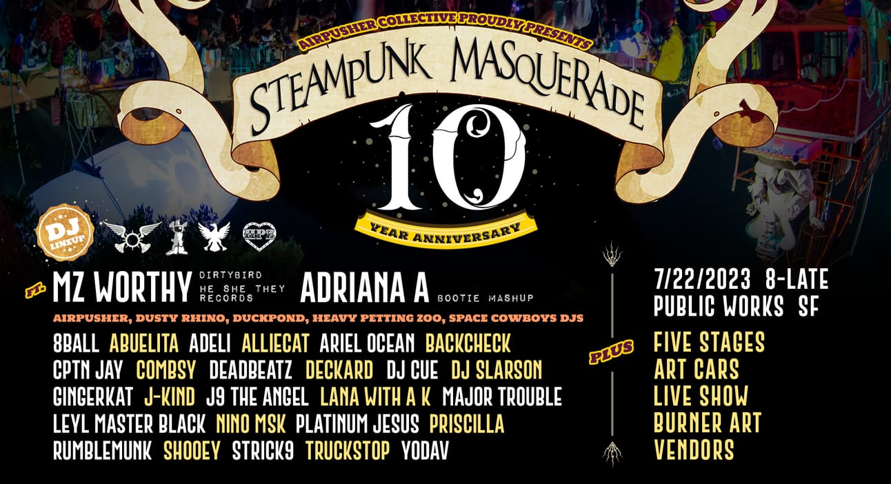The Space Cowboys will also be bringing out their famous Unimog car. And last, but not least, we will have the Airpusher Art Car itself set up, complete with its massive inflatable balloon, LED-backlit clouds, upper deck and lower DJ quarters. It’s a rare opportunity to get a taste of real art cars within the confines of the City and Steampunk Masquerade will be one of your best chances this summer. Sadly, due to completely reasonable fire restrictions, we will not be utilizing the massive fire poofers this year nor, due to scheduling conflicts, will the Flaming Lotus Girls be participating in an official capacity.