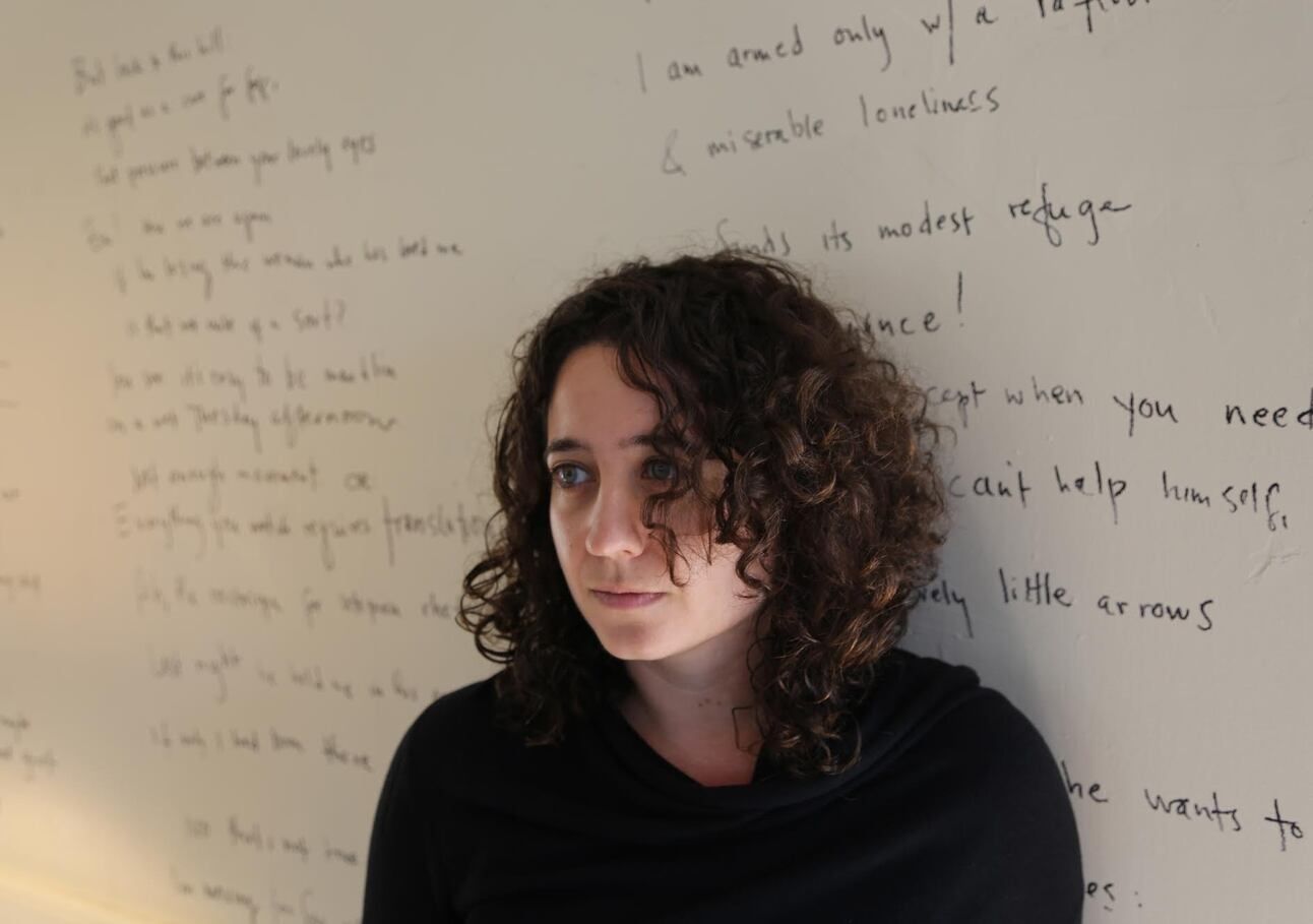 Onetime Open Space editorial director Claudia La Rocco poses in front of a poem she wrote within José Carlos Teixeira’s “Translation(s)” art project at Headlands Center for the Arts in Marin County in 2013, which encouraged visitors to respond to text fragments, audio pieces and films and even write on the wall. La Rocco will lead Small Press Traffic’s new publication The Back Room. (Photo courtesy José Carlos Teixeira)