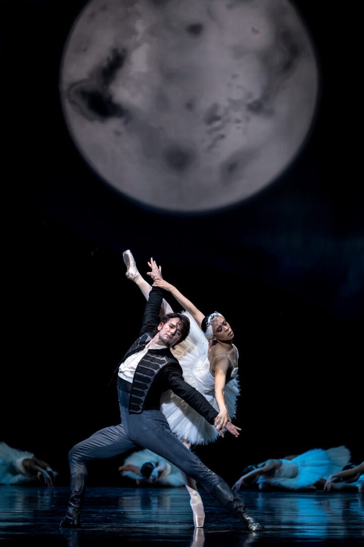 The Prince is stork raven mad about his swan as they parrot one another in the night. Nikisha Fogo and Aaron Robison in Tomasson’s Swan Lake // © Lindsay Thomas