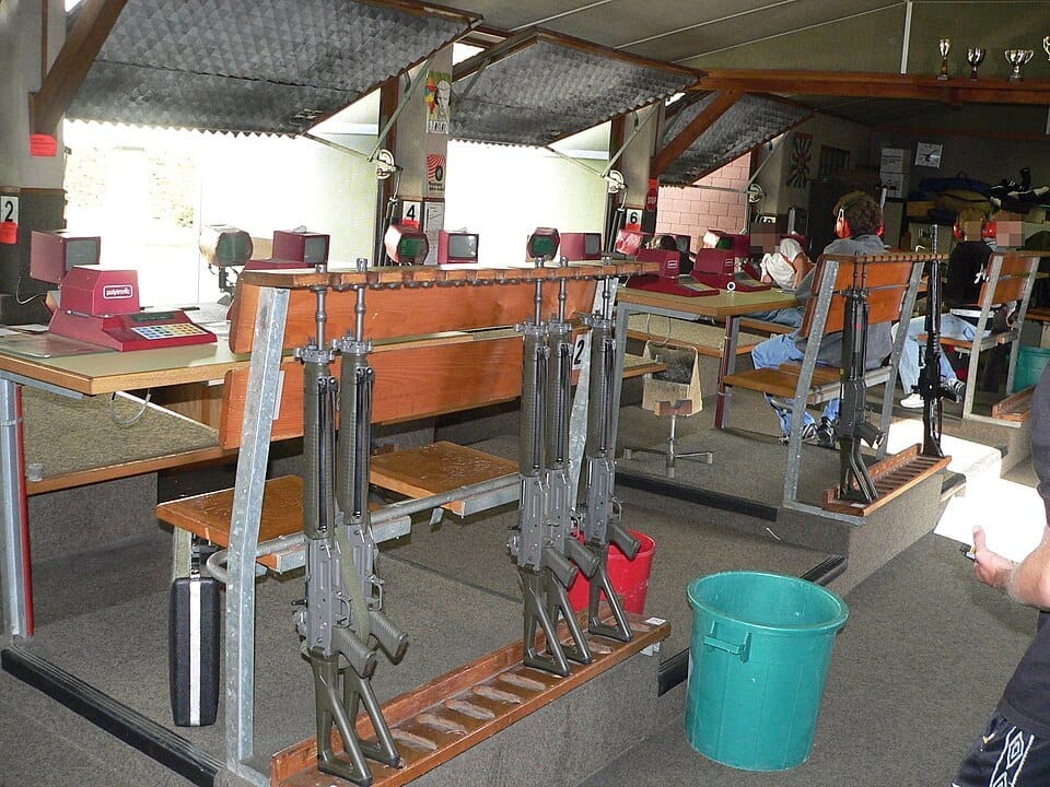 The federal shooting range of Versoix, Switzerland; people come to such ranges to complete mandatory training (Obligatorischeschiessen) with service arms, or to shoot for sport and competition. Creative Commons photo by Rama via Wikimedia Commons