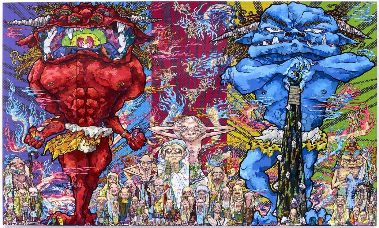 Red Demon and Blue Demon with 48 Arhats, 2013, by Takashi Murakami (Japanese, b. 1962). Acrylic and gold leaf and platinum leaf on canvas mounted on board. Courtesy of the artist and The Heller Group. Photo © Phillips