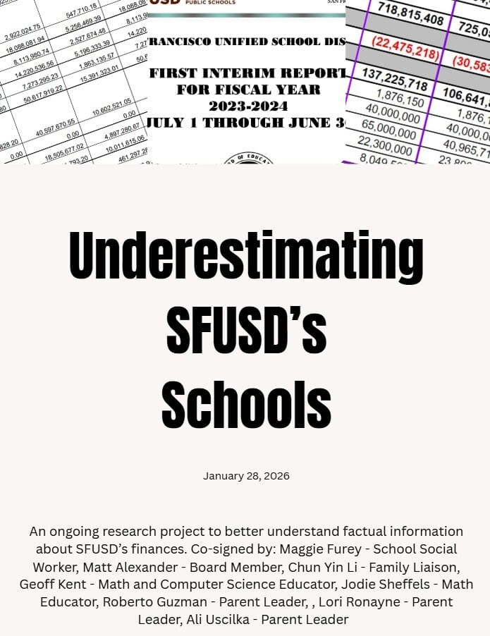 According to documents distributed by concerned parents, the district isn’t as cash-strapped as they want us to believe. The district is holding tightly onto a sizeable reserve, several times over what is required or recommended as a minimum. SFUSD ended the 2024–25 year with ~$150M more than projected during the 2025-26 budget season, and that information was not publicly shared until after $114 million in cuts were made for 2025-26. These concerned parents say it is even possible that SFUSD is in fact, operating with a structural surplus. A working group put together a resource for interested people to read more; this group includes a current board member as well as several educators.