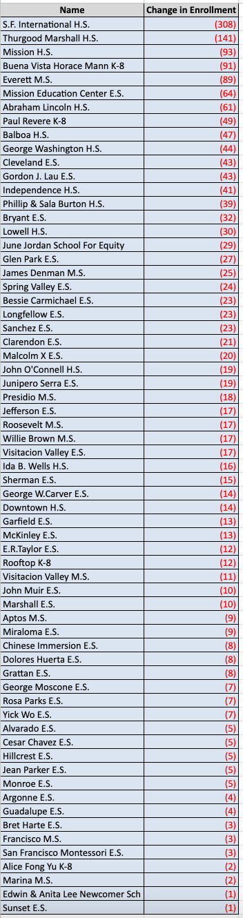 Reduction in available seats at several school sites. SFUSD has not responded to requests for comment.
