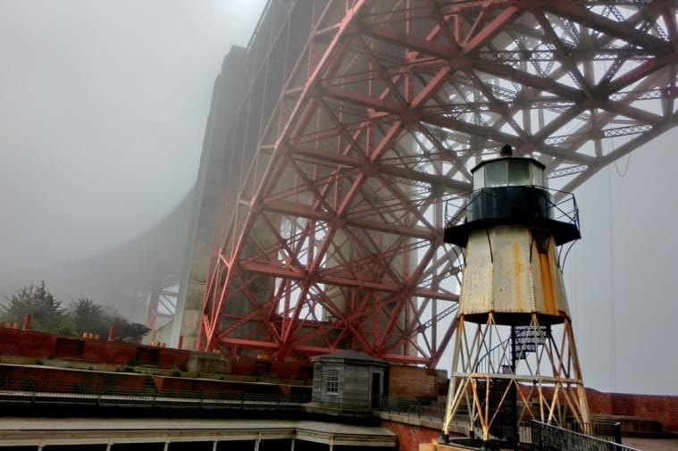 The underside of the approach to the Golden Gate Bridge with fog. Yes, gays will cruise in any weather.