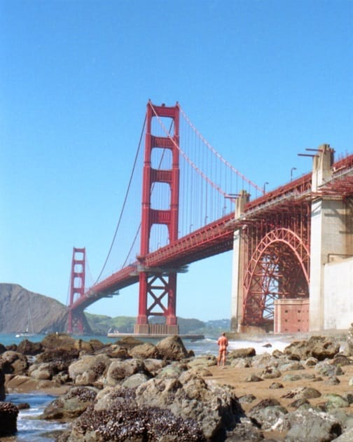 The hike down Battery Bluffs Trail takes you through gorgeous chaparral scrub and native California plant life. It follows a natural arroyo and offers landmark views of the Golden Gate Bridge, so close you can see where it’s rusting. It takes about twenty minutes to hit the water with another ten spent scrambling over slippery sharp rocks to Marshall’s Beach. It’s a sweat-breaking hike that’ll get you reaching for your water in no time. Believe me, you’ll ache significantly less the next day if you stretch your legs first.Unlike Baker and Ocean Beach (playas you can just walk out onto), Marshall’s Beach is difficult to reach. For good reason, too—it tends to keep the straights out. That said, I have run into unassuming families on my way down who think they’re on a robust hike to a China Beach-like destination. The mom carefully guided her kids over shoe-patinated serpentine rocks and poison oak. I sidled up to her, said hello, and leaned in close. “You know you’re going to a gay nude beach, right?” Her eyes got wide. “Okay kids, we’re gonna stay for just a little while, alright?”If you’re going to Marshall’s Beach, you know exactly why. It’s the one beach in San Francisco where gays can let it all hang out.