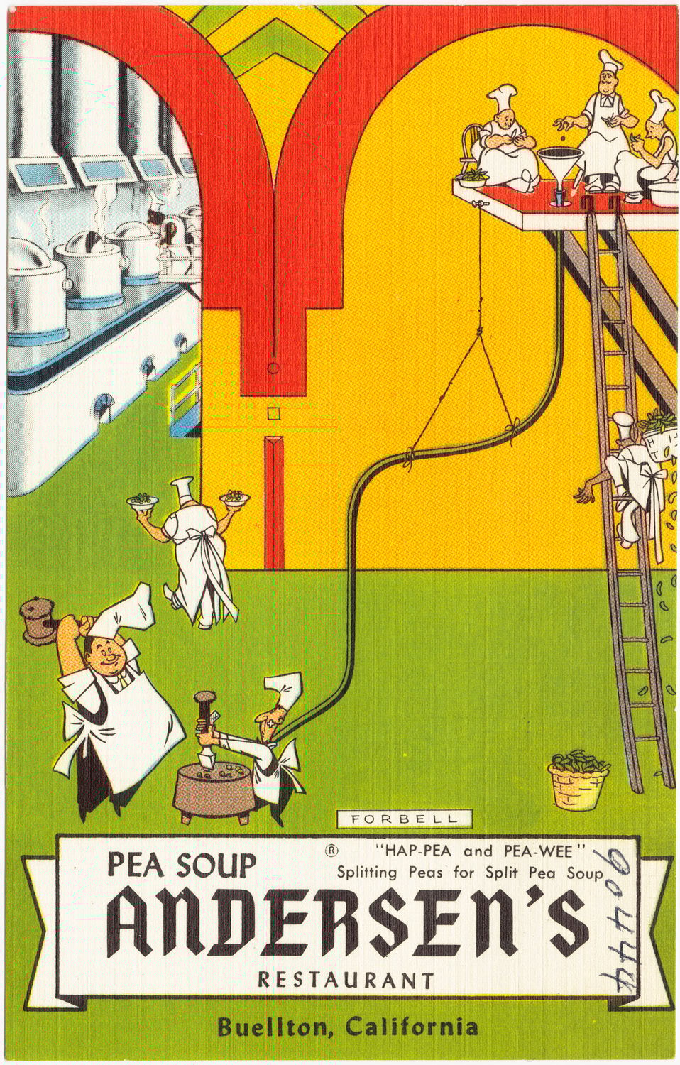 We’re not sure how long the Pea Soup Andersen’s History will be up online, so here’s a summary of the institution’s history. Don’t forget that there is still the newer Pea Soup Andersen’s roadside restaurant (est. 1976) in operation in Santa Nella on Highway 5, and a Pea Soup Anersen’s Inn in Buelton (separate ownership), so visit them!