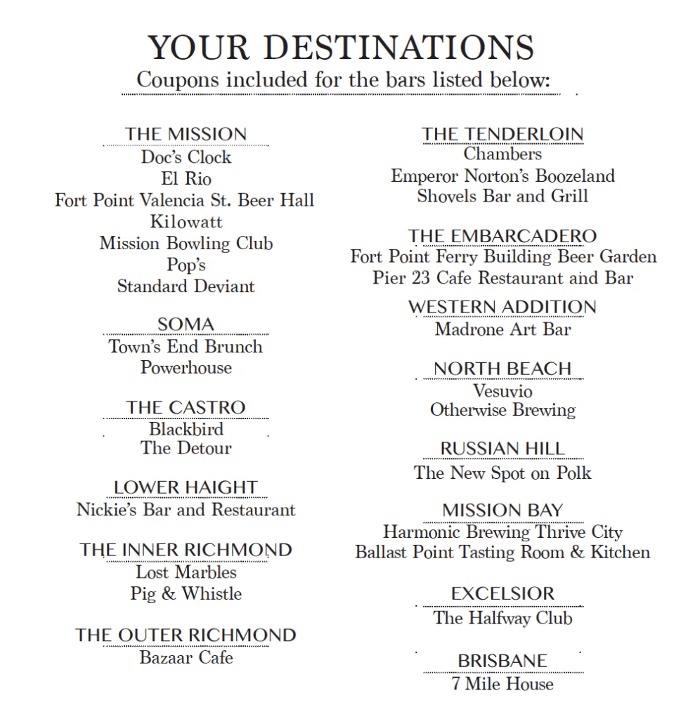 There’s no better way to explore San Francisco than to literally drink it in. This passport is amazing! Each one contains 28 coupons to buy one beer, get a second beer FREE at 28 of the finest locally owned bars, breweries, dives, diners and restaurants in SF.