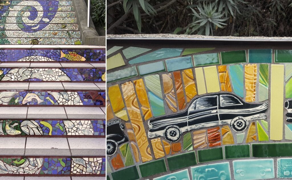 My friends and I love hiking. We call much of our hikes around the city “urban hikes”. My friend Annou and I love visiting any of the mosaic stairs created by Barr. At the top of the 16th Ave. mosaic stairs, you can see all the way out to the Golden Gate Bridge and take in the entire Sunset District from the top as well. If you’re starting to feel tired of living in the city, this view will help you fall back in love with SF. Fun fact: Barr lives in The Sunset. I’ll now forever think to myself, “Ailleen Barr is somewhere down there”.  The meaning and story behind the 16th Avenue stars is really interesting. Barr recalls, “The 16th Ave Tiled steps, which I collaborated on with Colette Crutcher, has a Sea to Sky theme. Beginning at the bottom steps you see an underwater scene with fish and sea creatures in swirls of blue representing the ocean. As you move up the stairways, the colors gradually change and the design transforms from the sea to a river. The riverbank teems with birds and small creatures. Climbing upwards the river becomes narrower as it flows from the mountains. Above the mountains, the sky appears and then fades darker to the moon with its contrasting mirror. At the very top flight of the steps, the sun shines with a yellow, orange, and red tile mosaic. The project was mainly funded by the local community through donor tiles. You can see the names of the donors on the handmade tile depicting fish, shell, bird and animals, each one unique.”