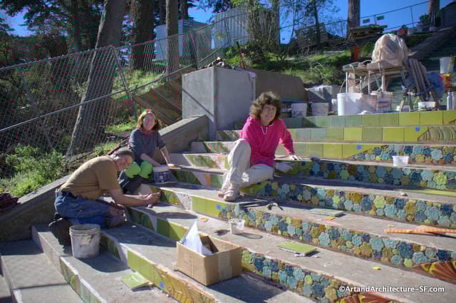 “My first commission in San Francisco was for the Recreation Center at West Portal, through the SF  Arts Commission. The 16th Ave Tiled Steps was my second commission here. I’ve done about 20 public art projects here so far. Everything from staircases to murals, seating areas, benches, and fountains. I have also worked on some free-standing sculptures. I have had projects in public parks and spaces, schools, though private commissions and on MUNI,” recalls Barr. Interestingly, The Lincoln Steps are Barr’s favorite commission she’s done. I am not surprised. The design of these stunning mosaic stairs is striking when you see them from the street. When you’re up close, you can see all fo the detail that went into the tiles. So much of what Barr does is by hand. I can’t imagine how long this took her and her team to create.“The Lincoln Park Steps on California Street, which I created solo, was the most challenging in terms of size and I am very proud of it. The 16th Ave Tiled Steps holds a special place in my heart as I learned so much doing that project and it opened up many other opportunities for me. It was the first project I collaborated on with Colette Crutcher and we have worked on many other projects together over the years. The 16th ave Tiled Steps is also a grassroots project, initiated, fundraised, and developed by the local community,” says Barr.