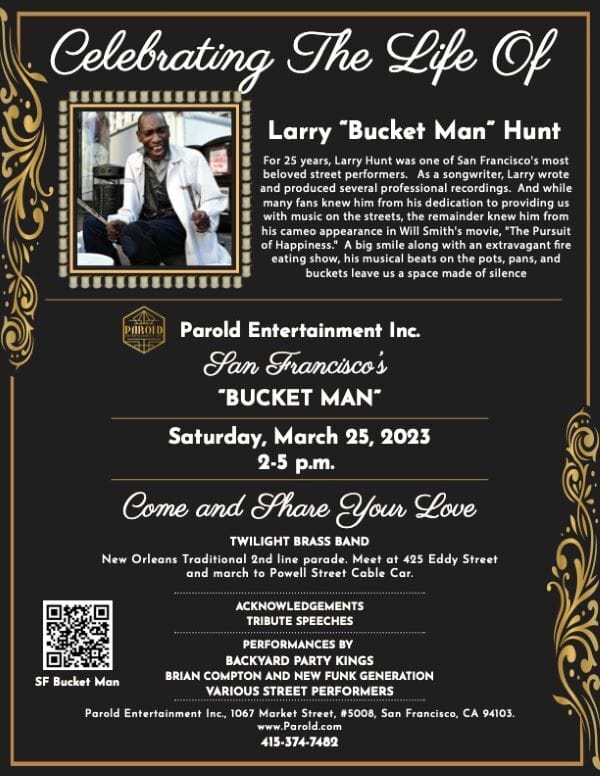 Celebrating the Life of Larry “Bucket Man” Hunt3/25 | Parold Entertainment Inc | 1067 Market Street #5008, SF | 2-5 pm | free