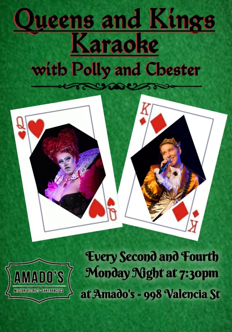 Queens & Kings Karaoke w/ Chester & Polly3/27 | Amado’s | 998 Valencia St, SF | 7:30 pm | free
