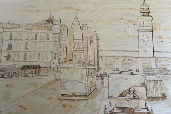 This pyrography work entitled Market Street, San Francisco is inspired by the film, A Trip Down Market Street taken by the Miles Brothers four days before the 1906 earthquake. Swank took stills from the film, referencing special elements, researched archival photographs, and inserted representational figures and places.