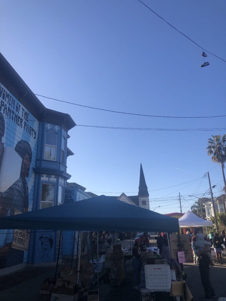 But there is one front porch that continues to be a great locus of greeting and neighborhood congregation. That porch is at 831 Center street and is known as the Mural House – because emblazoned in brilliant blue and black, the colors stretching up to meet the Oakland sky, is a mural that honors the women of the Black Panther Party.