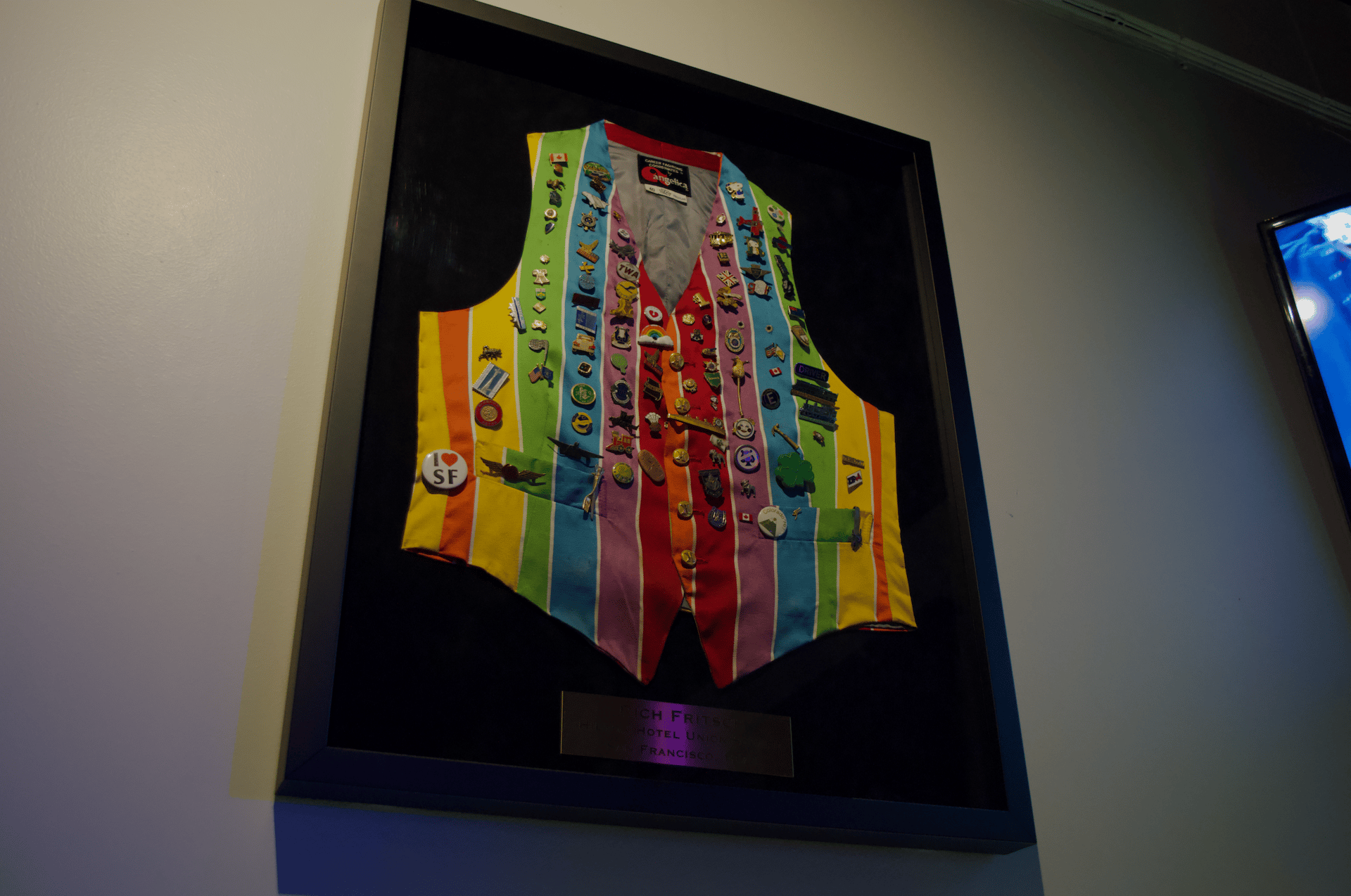 Father of Josh and Justin and bartender Rich Fritsch's vest, covered in pins from his regular customers. Now hanging on the wall of Philosopher's Club. Photo by Ava Austin